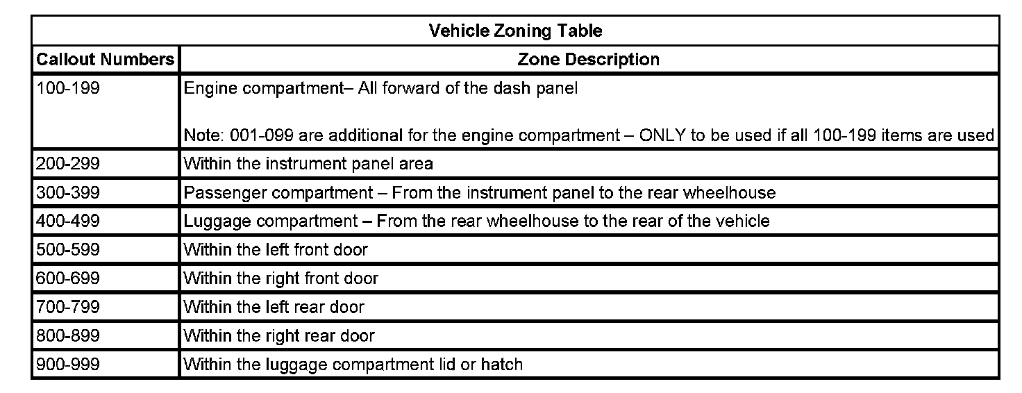 All grounds, in-line connectors, pass-through grommets, and splices have identifying numbers that correspond to where they are located in the vehicle. The following table explains the numbering system.