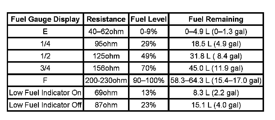 The information in this table is intended for use with the J 33431-C Signal Generator and Instrument Panel Tester. The fuel level sensor values represent the test values to be used on the Signal Generator to drive the fuel gage display to the indicated positions. Vehicles that require more than one fuel level sensor calculate gage position from many possible resistance combinations of fuel levels between the two tanks. Therefore, the values in the table may not correlate directly to readings taken from the vehicle primary or secondary sending units.