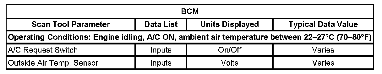 Use the Scan Tool Data Display Values and Definitions in order to assist in diagnosing the HVAC. Compare the vehicles actual scan tool data with the typical data display value table information. Use the data information in order to aid in understanding the nature of the concern when the vehicle does not match with the typical data display values.