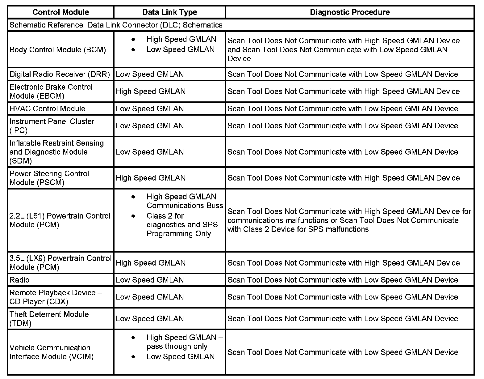 This table identifies which serial data link that a particular module uses for in-vehicle data transmission. Some modules may use more than one data link to communicate. Some modules may have multiple communication circuits passing through them without actively communicating on that data link. This table is used to assist in correcting a communication malfunction. For the description and operation of these serial data communication circuits, refer to Data Link Communications Description and Operation.