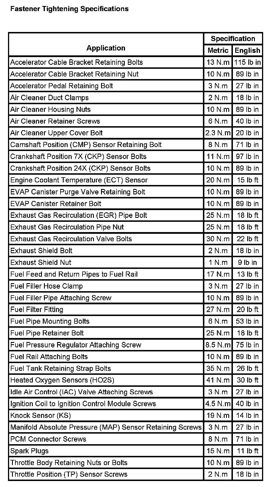 Fastener Tightening Specifications: