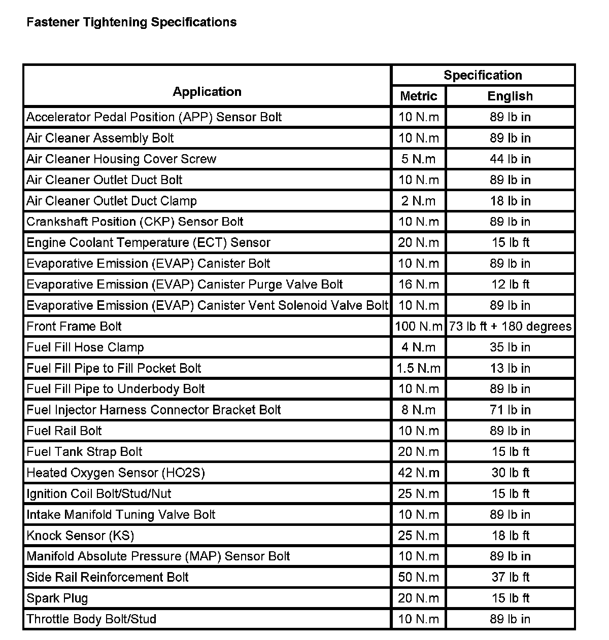 Fastener Tightening Specifications: