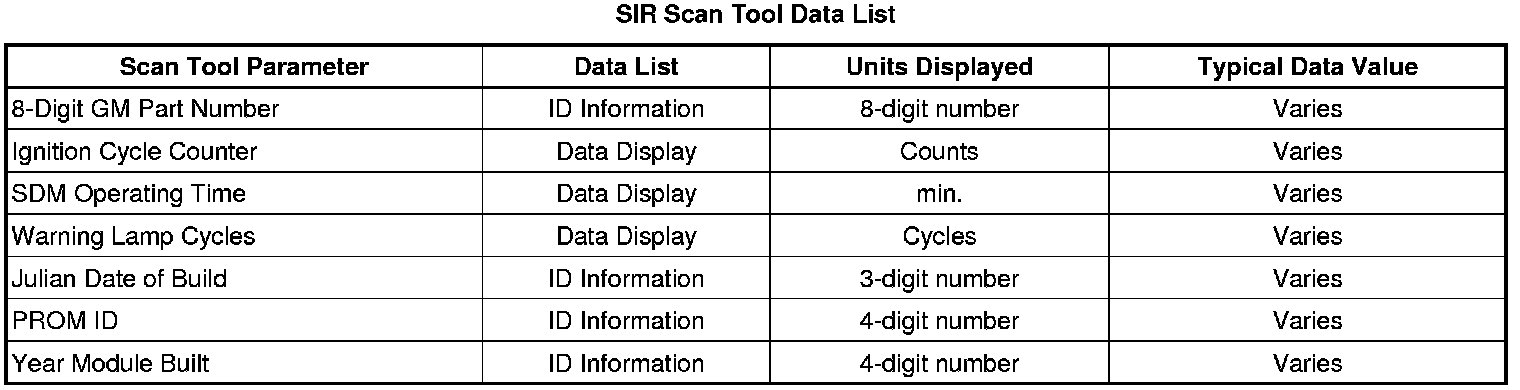 Use the SIR Scan Tool Data List as directed by a diagnostic table or in order to supplement the diagnostic procedures. Begin all of the diagnostic procedures with the Diagnostic System Check - SIR. Use the SIR Scan Tool Data List after the following is determined: