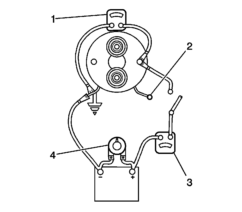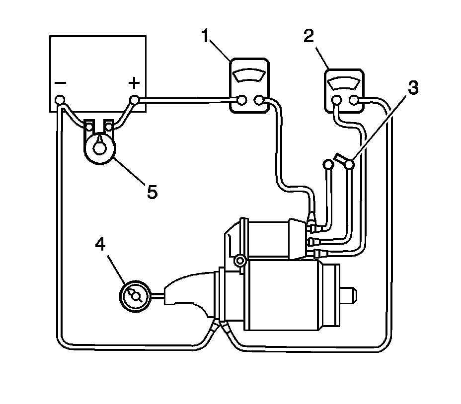 6. To begin the no-load test, close the switch and compare the RPM, the current, and the voltage readings with the specifications. Refer to Starter Motor Usage [1][2]Specifications. Make disconnections only with the switch open. Use the test results as follows: