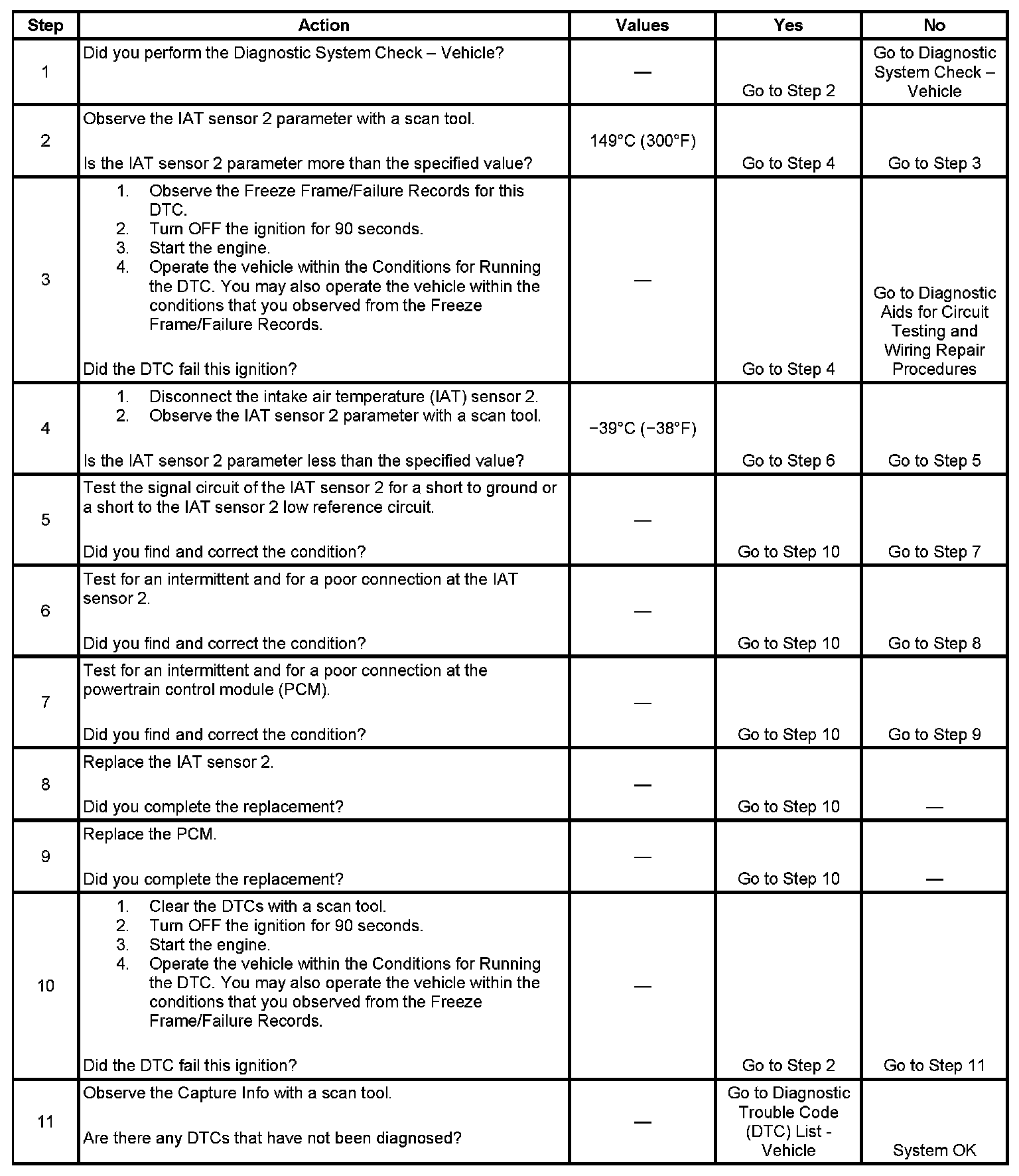 The PCM detects that the IAT sensor 2 parameter is more than 149°C (300°F) for more than 5 seconds.