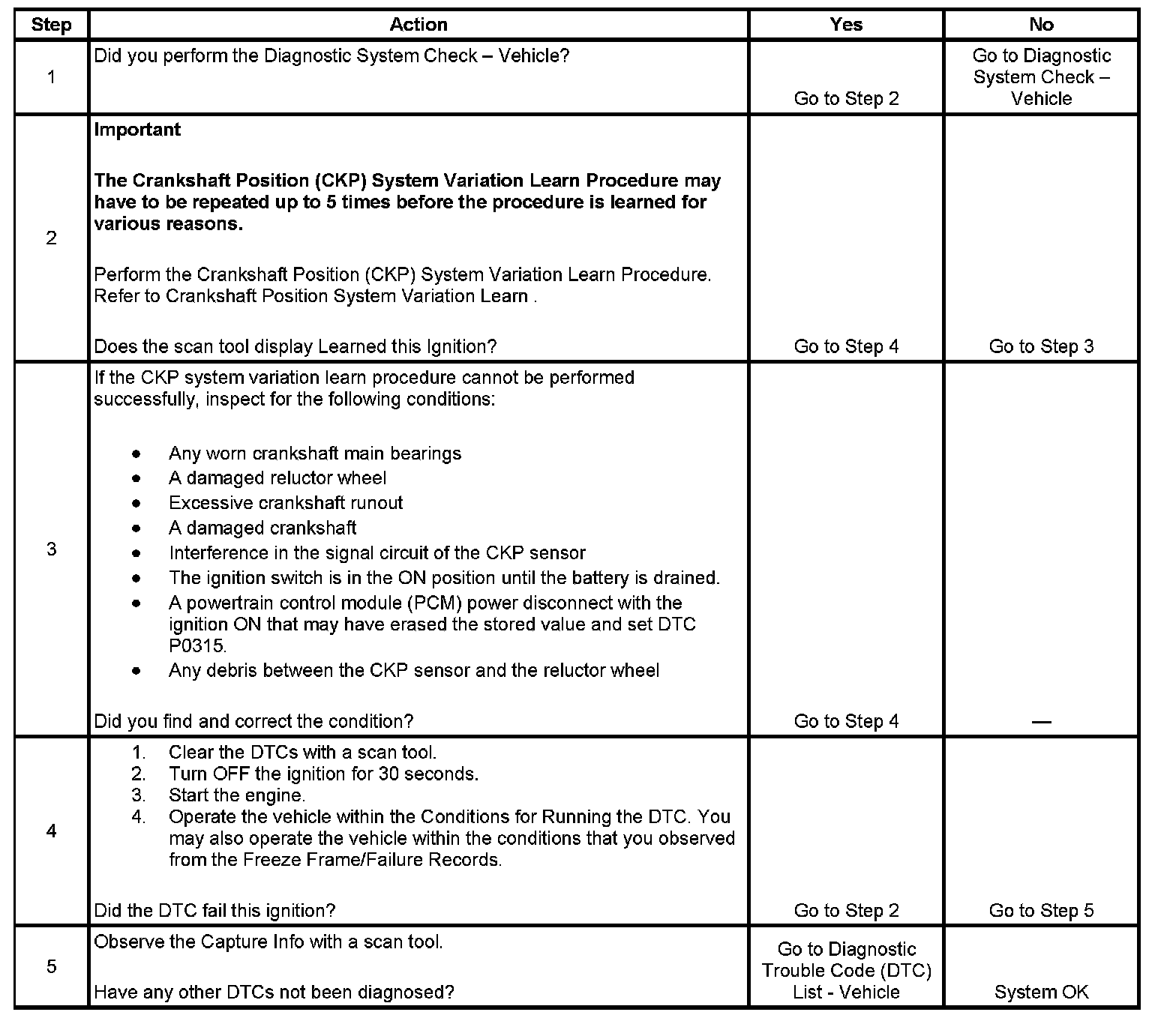 The Crankshaft Position (CKP) system variation learn feature is used to calculate reference period errors caused by slight tolerance variations in the crankshaft, and the CKP sensor. The calculated error allows the powertrain control module (PCM) to accurately compensate for reference period variations. This enhances the ability of the PCM to detect misfire events over a wider range of engine speed and load. The PCM stores the CKP system variation values after a learn procedure has been performed. If the actual crankshaft position variation is not within the CKP system variation compensating values stored in the PCM, DTC P0300 may set. If the PCM detects that the CKP system variation values are not stored in the PCM memory, DTC P0315 sets.