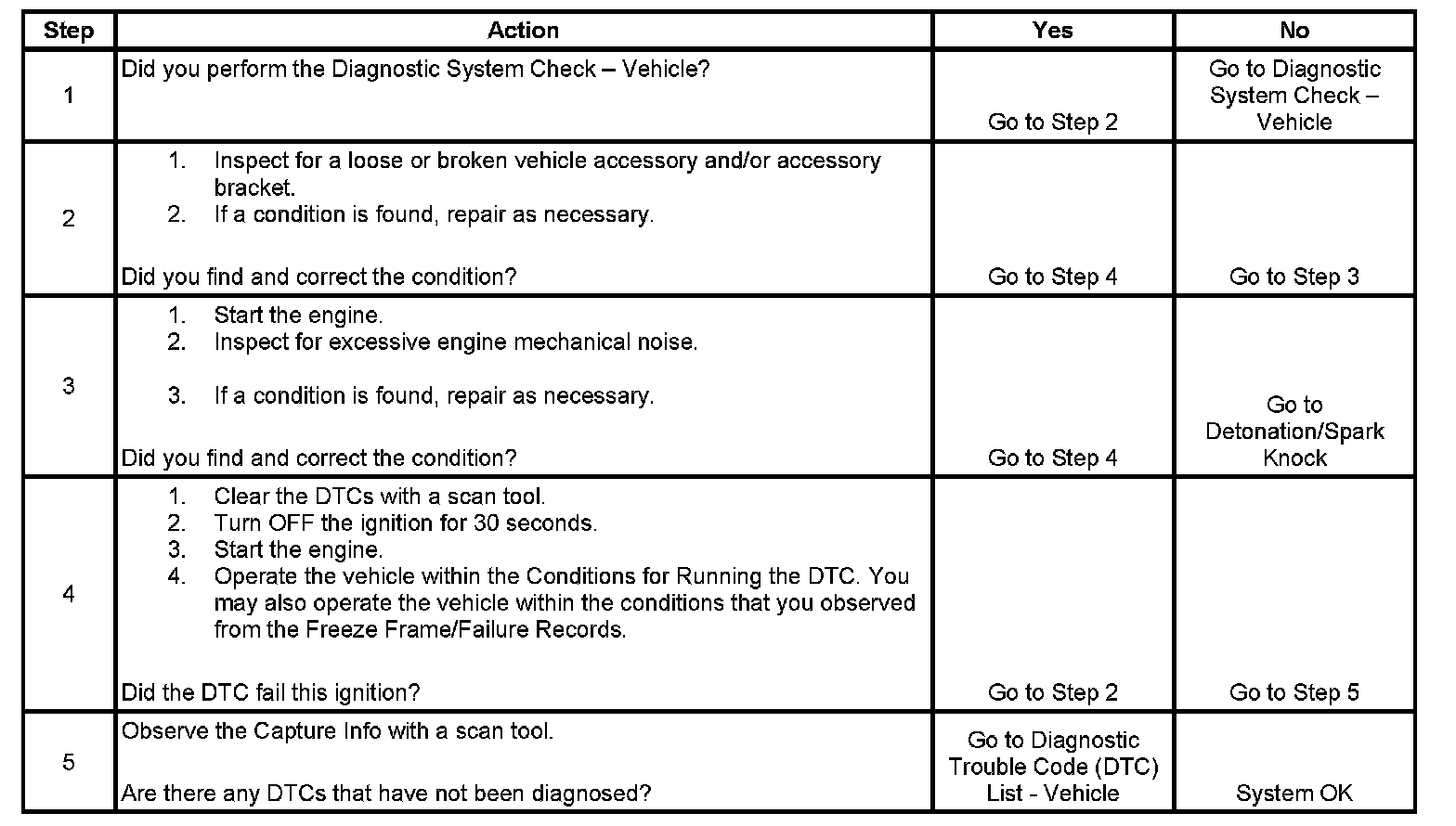 The knock sensor (KS) system enables the powertrain control module (PCM) to control the ignition timing for the best possible performance while protecting the engine from potentially damaging levels of detonation. The KS is located on the intake side of the engine block. The KS produces an AC voltage signal that varies depending on the vibration level during engine operation. The PCM adjusts the spark timing based on the amplitude and the frequency of the KS signal. The PCM receives the KS signal through a signal circuit. The KS ground is supplied by the PCM through a low reference circuit. The PCM learns a minimum KS noise level at idle and uses calibrated values for the rest of the RPM range. The PCM should monitor a normal KS signal within the noise channel. When the PCM detects a KS signal that varies outside of the noise channel, the PCM will retard the spark timing until the knock goes away. If the PCM is operating on large amounts of spark retard and is unable to eliminate the knock, DTC P0326 will set.