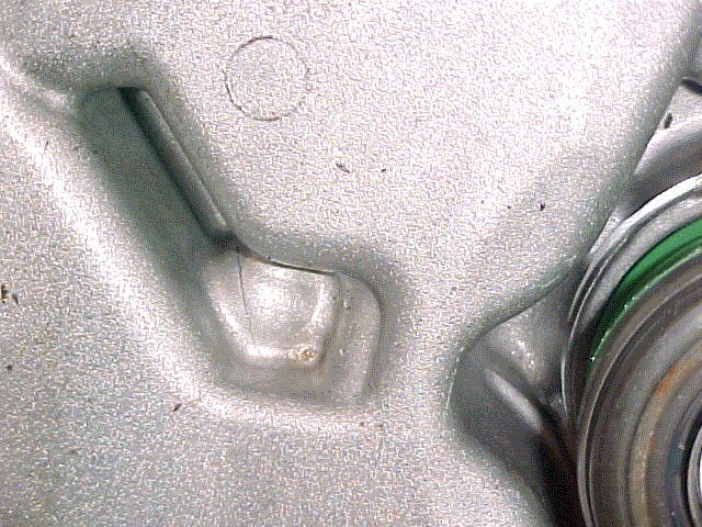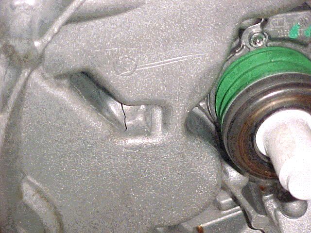 This condition may be caused by excessive front wheel hop during wide open throttle (WOT) acceleration events. Excessive wheel hop transmits a torsional shock load into the transmission case. This may cause the transmission case to fracture (as shown in graphic below) and transmission fluid to leak into the clutch housing.
