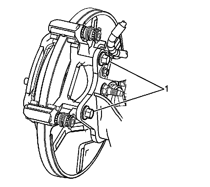 Notice: Support the brake caliper with heavy mechanic's wire, or equivalent, whenever it is separated from its mount and the hydraulic flexible brake hose is still connected. Failure to support the caliper in this manner will cause the flexible brake hose to bear the weight of the caliper, which may cause damage to the brake hose and in turn may cause a brake fluid leak.