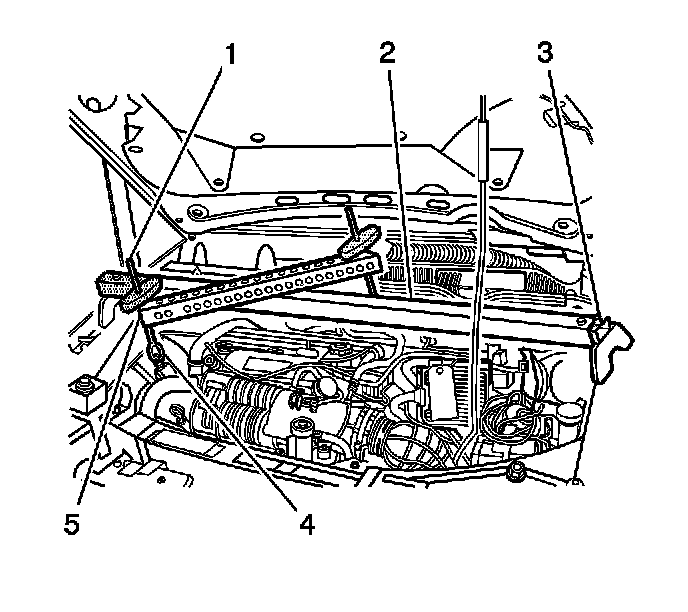 1. Place the engine support fixture long bar (2), from the J 28467-B across the engine compartment.