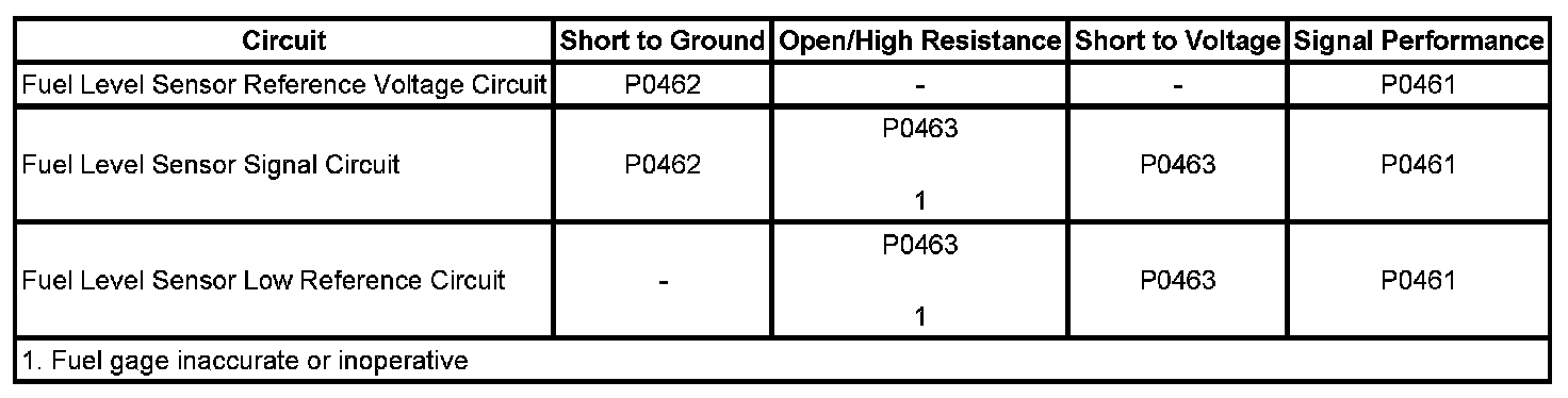 The fuel level sensor changes resistance in response to the fuel level. The powertrain control module (PCM) monitors the signal circuit of the fuel level sensor in order to determine the fuel level. When the fuel tank is full, the sensor resistance is high and the PCM senses a high signal voltage. When the fuel tank is empty, the sensor resistance is low and the PCM senses a low signal voltage. The PCM uses the signal circuit of the fuel level sensor in order to calculate the percentage of remaining fuel in the tank. The PCM sends the fuel level percentage via GMLAN serial data circuit to the body control module (BCM). The BCM sends a GMLAN message to the instrument panel cluster (IPC) in order to display the fuel level percent on the fuel gage. The fuel information is also used for misfire and evaporative emission (EVAP) diagnostics.