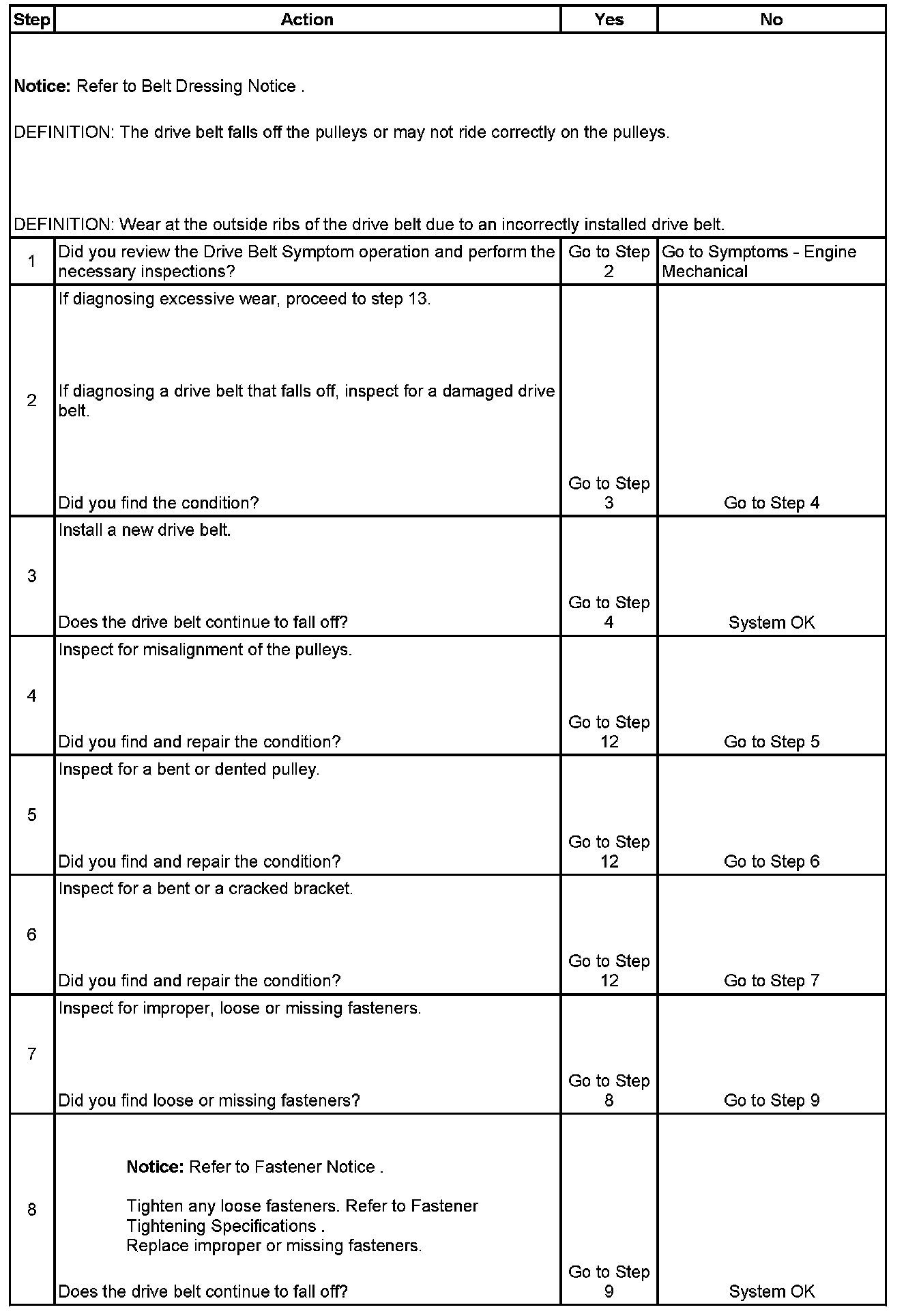 2. This inspection is to verify the condition of the drive belt. Damage may of occurred to the drive belt when the drive belt fell off. The drive belt may of been damaged, which caused the drive belt to fall off. Inspect the belt for cuts, tears, sections of ribs missing, or damaged belt plys.