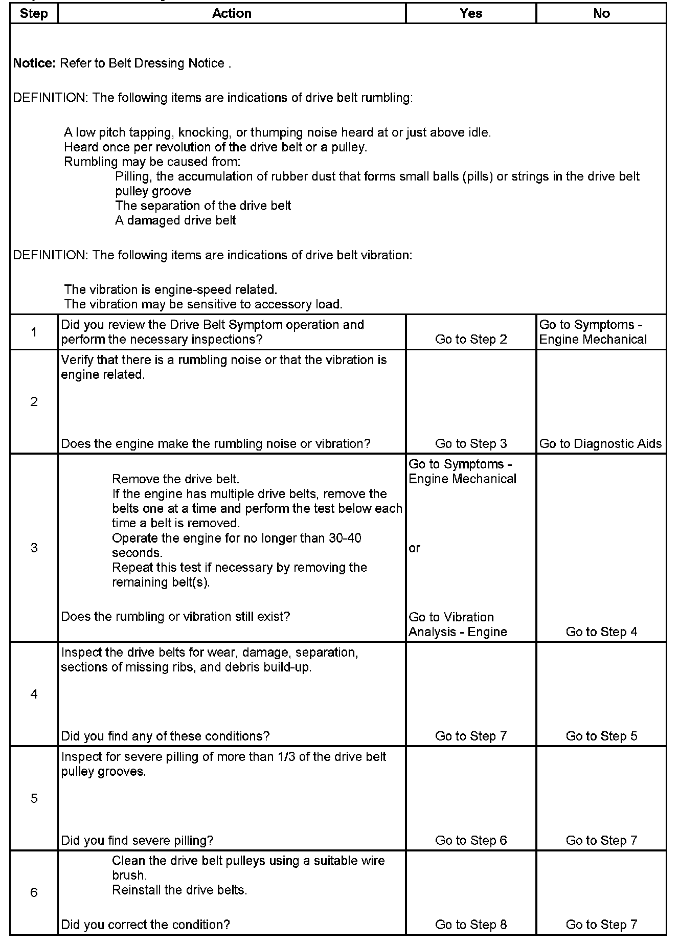 3. This test is to verify that one of the drive belts is causing the rumbling noise or vibration. Rumbling noise may be confused with an internal engine noise due to the similarity in the description. Remove only one drive belt at a time if the vehicle has multiple drive belts. When removing the drive belts the water pump may not be operating and the engine may overheat. Also DTC's may set when the engine is operating with the drive belts removed.