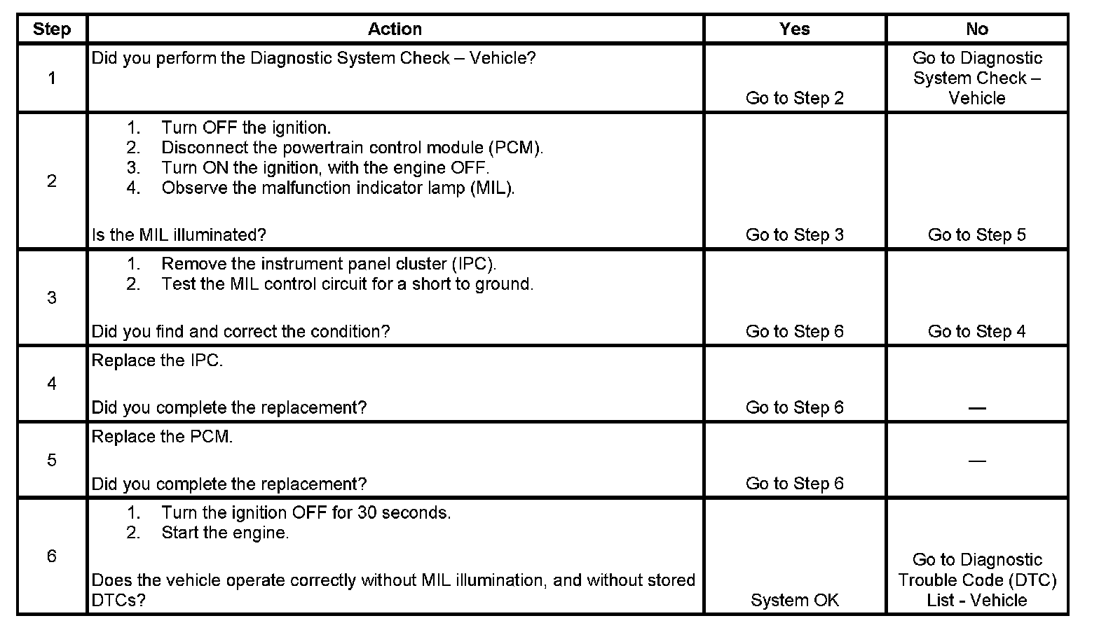 2. This step determines if the condition is with the MIL control circuit or the PCM.