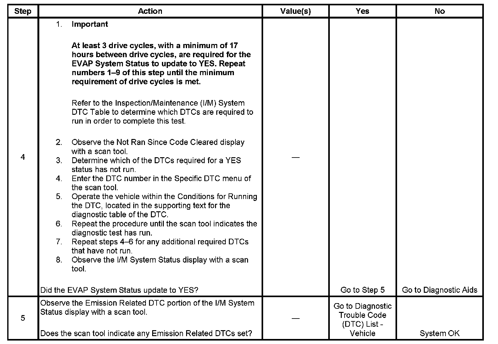 The first failure of a type B DTC does not constitute a final determination of pass or fail, and will not update the I/M System Status to YES. A second trip is required, and all the conditions to run must be met in order for the test to run again. These conditions may include a partial to complete engine cool down.