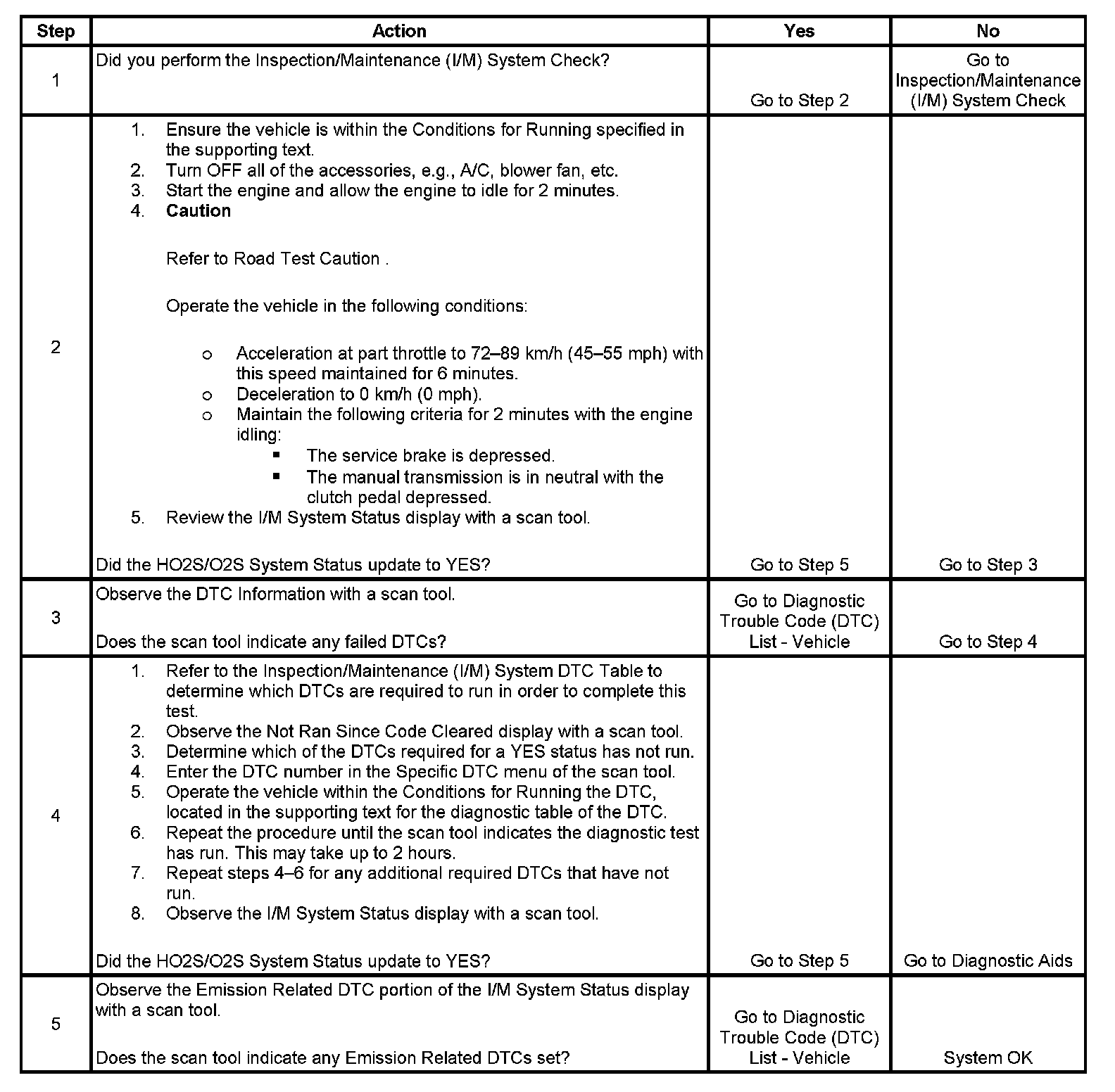 The purpose of this procedure is to satisfy the enable criteria necessary in order to execute the inspection/maintenance (I/M) readiness diagnostics for the Oxygen Sensor/Heated Oxygen Sensor (O2S/HO2S) System. Ensure the vehicle meets the requirements listed in Conditions for Running before performing this test. Failure to meet the necessary requirements may produce inaccurate test results.
