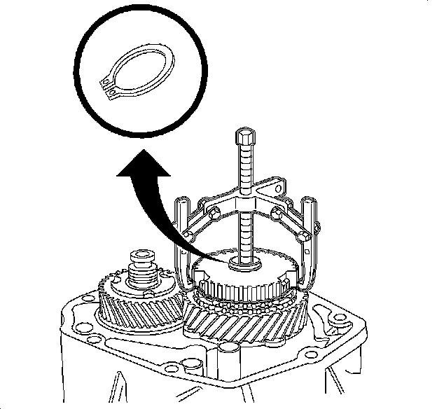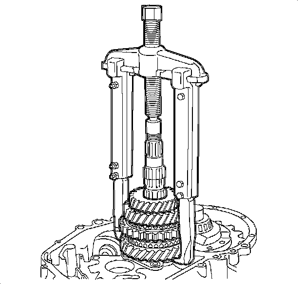 16. Use the J 25031-A or equivalent to remove the 5th gear synchronizer hub.