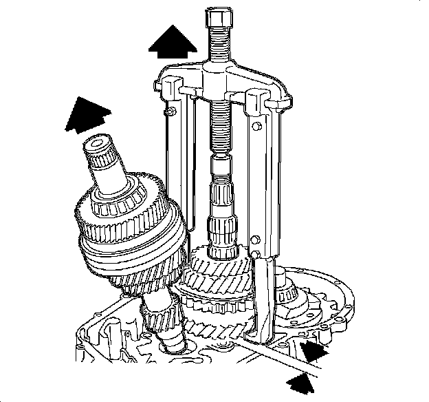 38. Carefully tighten the puller until the remaining output shaft gears are up far enough to allow the removal of the input shaft, approximately 15 mm (0.6 in).