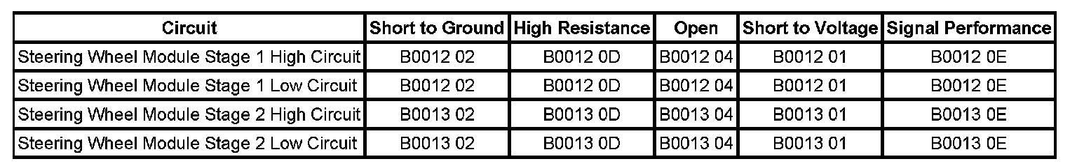 The steering wheel module high and/or low circuit is short to voltage for 120 milliseconds.