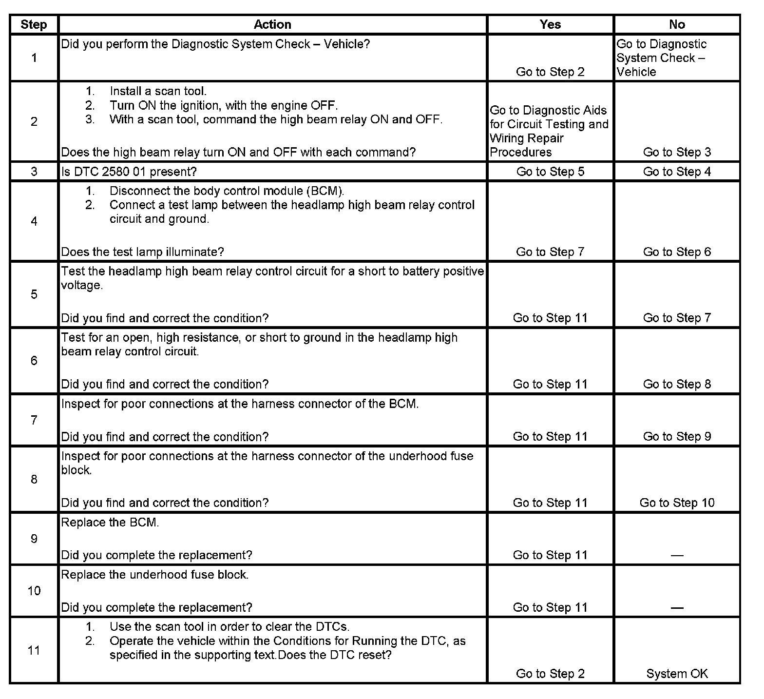 The high beam relay is controlled by the body control module (BCM). The BCM provides ground to the high beam relay control circuit in order to turn ON the high beam relay. When the high beam relay control circuit opens, becomes shorted to voltage, or becomes shorted to ground without being commanded ON by the BCM, DTC B2580 is set.