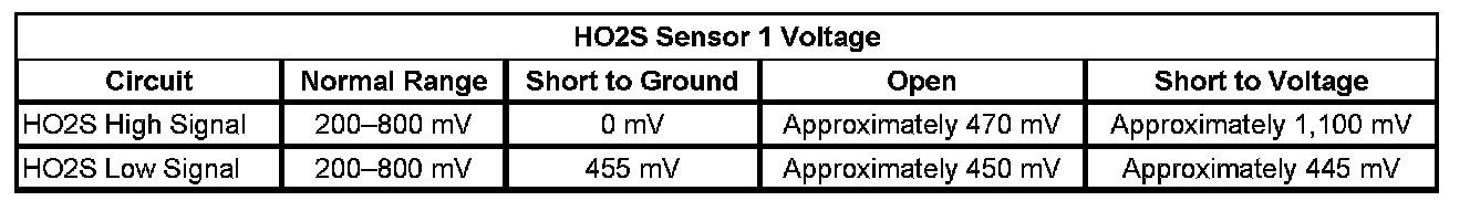 * The ECM detects that the HO2S 1 Voltage parameter is less than 800 mV.