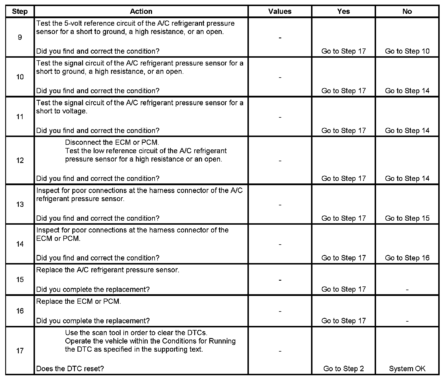 * The ECM or PCM detects that the A/C pressure is less than 34Kpa or 4.93 psi (0.25 volt).