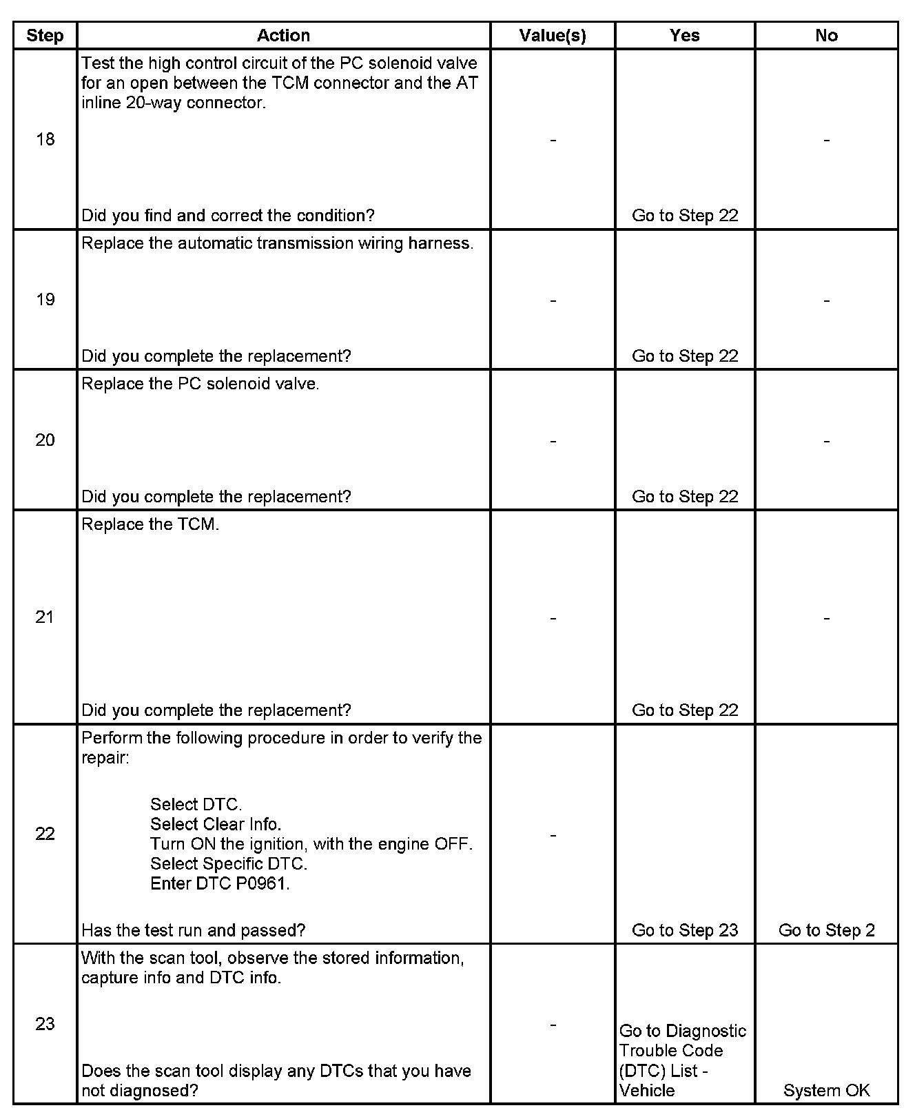 When the TCM detects a continuous open, short to ground or short to voltage in the PC solenoid valve circuit, then DTC P0961 sets. DTC P0961 is a type C DTC.