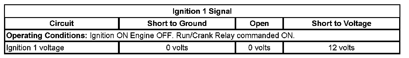 ^ If the applicable scan tool parameter is less than the specified value, test the ignition 1 circuit for an open/high resistance. If the circuit tests normal, replace the ECM.