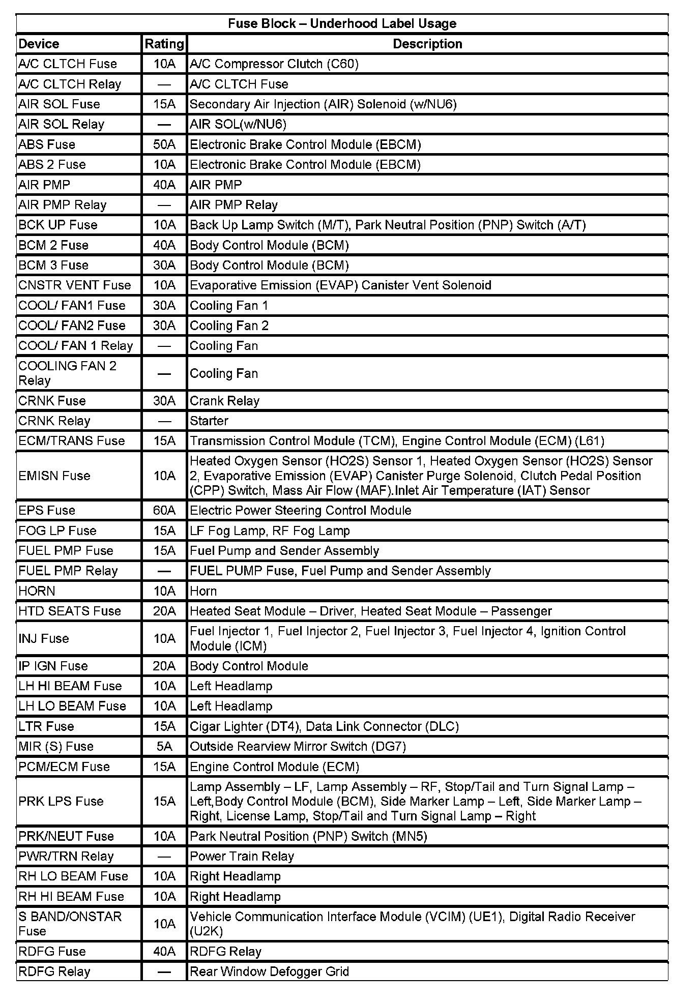 Fuse Block - Underhood Label Usage (Part 1):