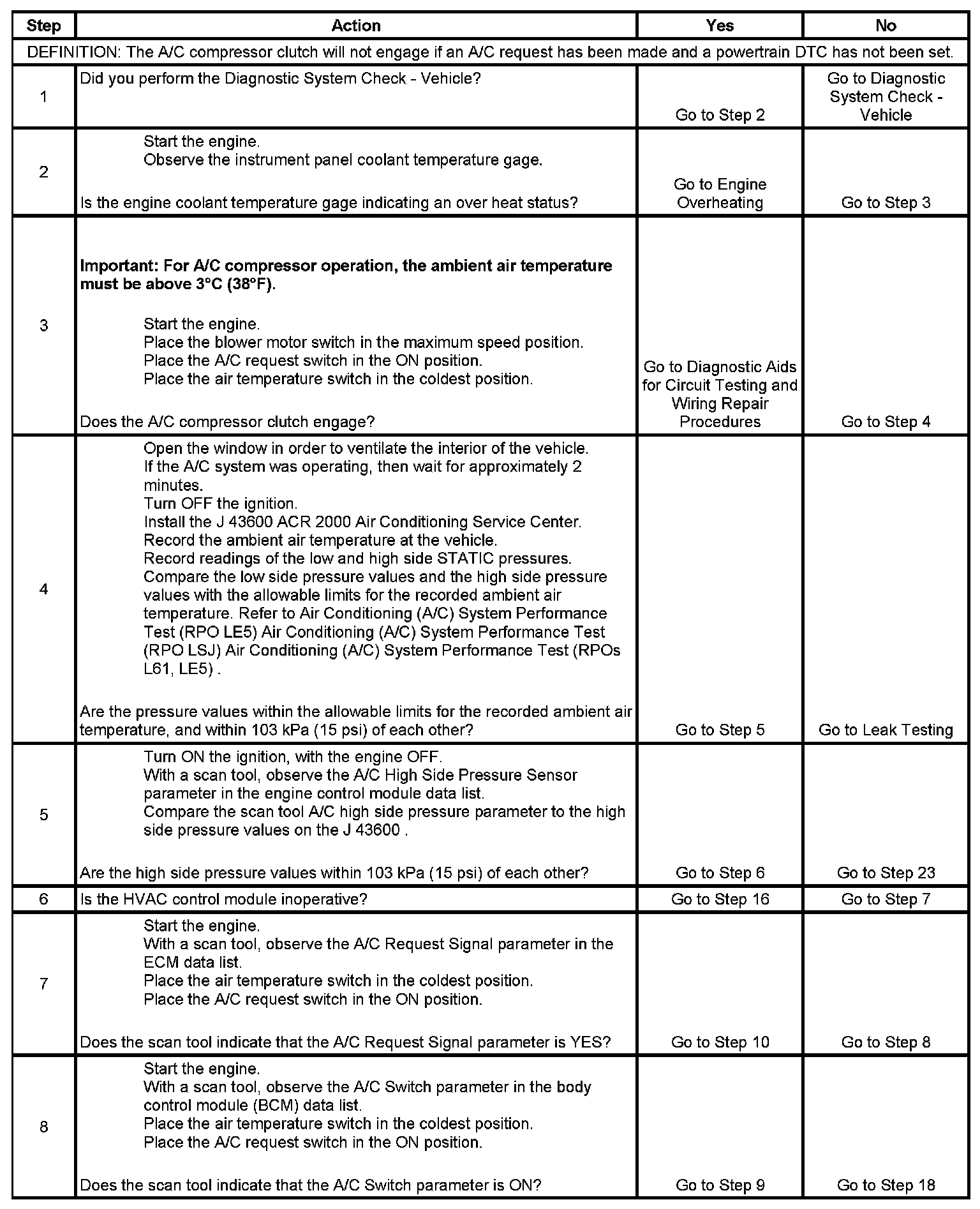 2. The A/C compressor relay output is disabled if engine coolant temperature is above 123°C (253°F). The instrument panel engine coolant gage will indicate overheating.