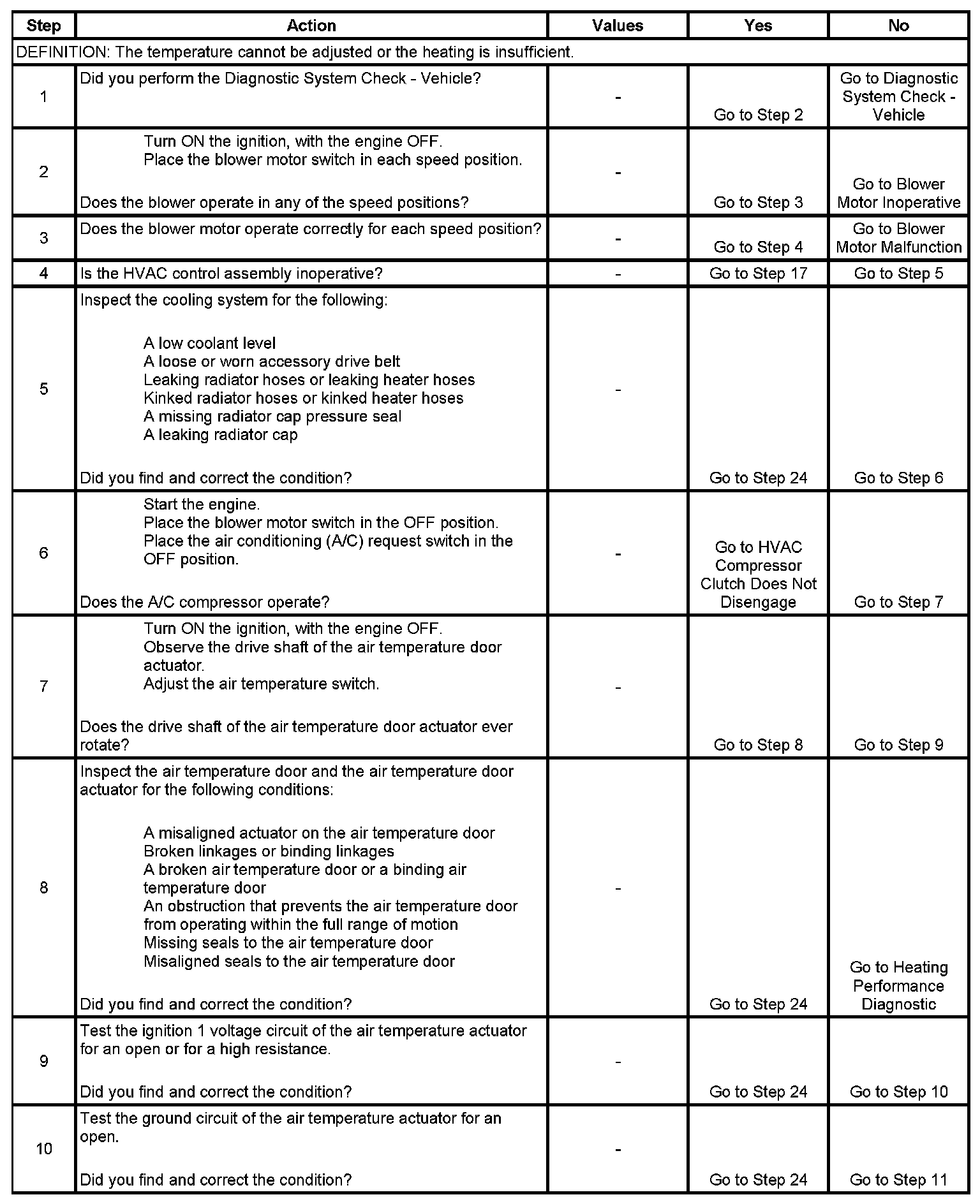 The numbers below refer to the step numbers on the diagnostic table.