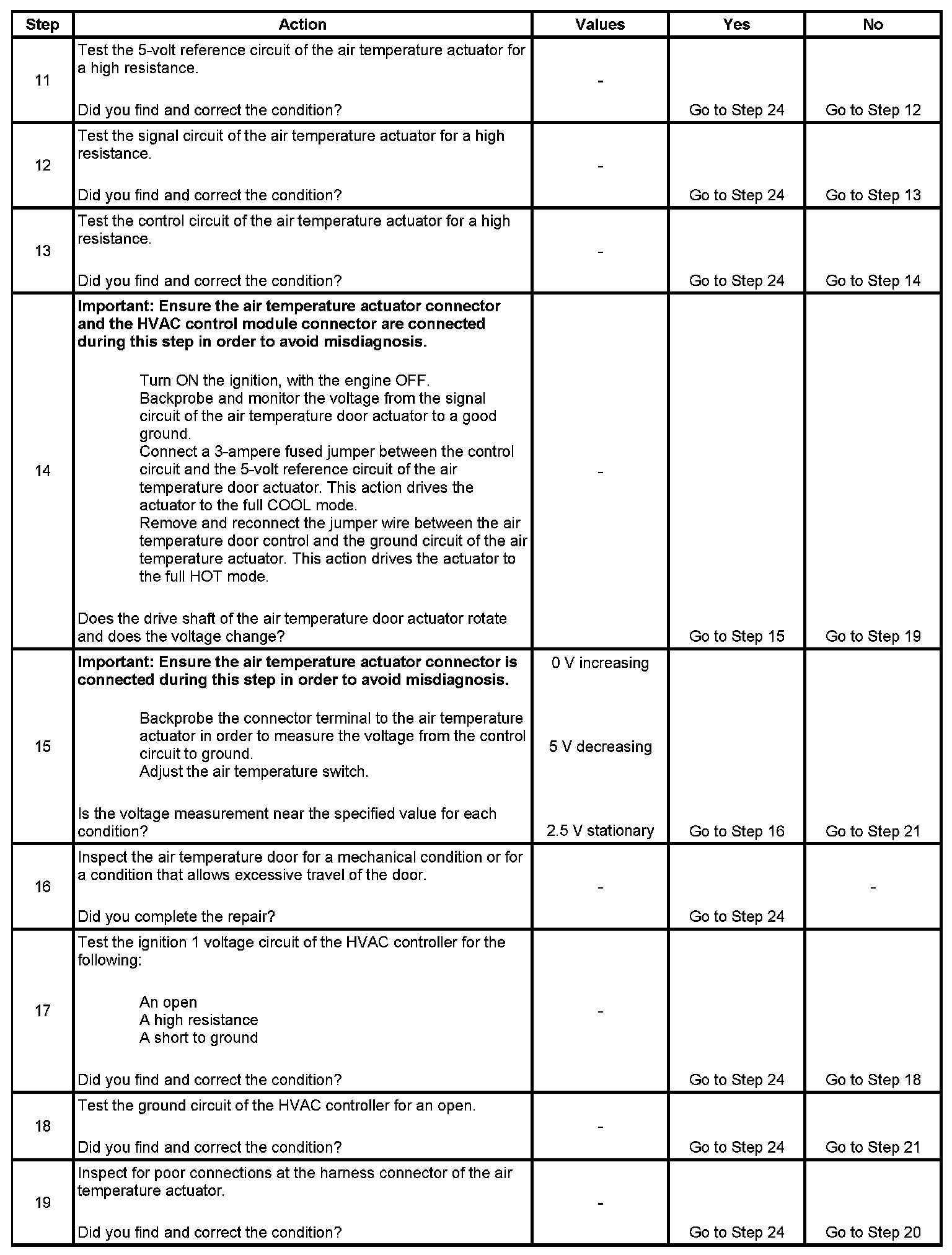 14. The voltage will vary between 0-5 volts during normal operation. Ensure to observe the air temperature actuator driveshaft and the volt meter when jumping the control circuit with 5-volt reference and the ground circuits. The air temperature actuator and the HVAC control assembly connectors must be connected during this step.