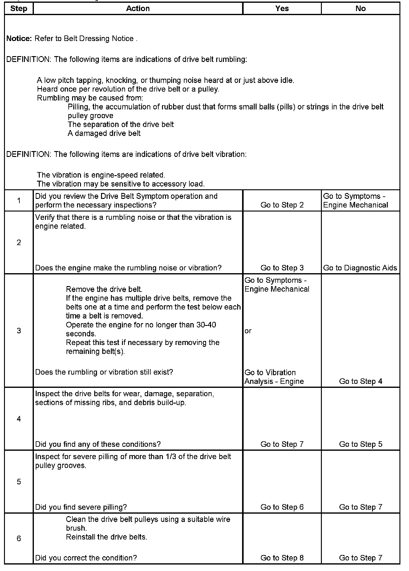 3. This test is to verify that one of the drive belts is causing the rumbling noise or vibration. Rumbling noise may be confused with an internal engine noise due to the similarity in the description. Remove only one drive belt at a time if the vehicle has multiple drive belts. When removing the drive belts the water pump may not be operating and the engine may overheat. Also DTC's may set when the engine is operating with the drive belts removed.