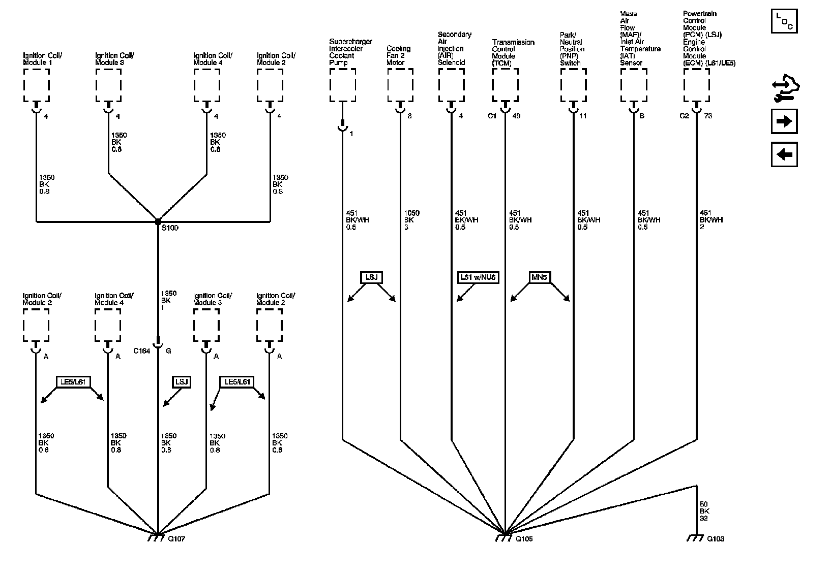 The locations for the Connectors, Grounds, Splices, and Grommets shown within these diagrams can be found via their numbers at Vehicle Locations.