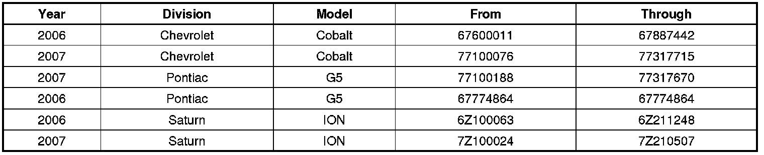 Involved are certain 2006 model year Chevrolet Cobalt, Pontiac Pursuit, and Saturn ION vehicles originally sold or currently registered in Arizona and Nevada; and 2007 Chevrolet Cobalt, Pontiac G5, Saturn ION vehicles originally sold, or currently registered, in Arizona, California, Florida, Nevada, and Texas, and built within these VIN breakpoints: