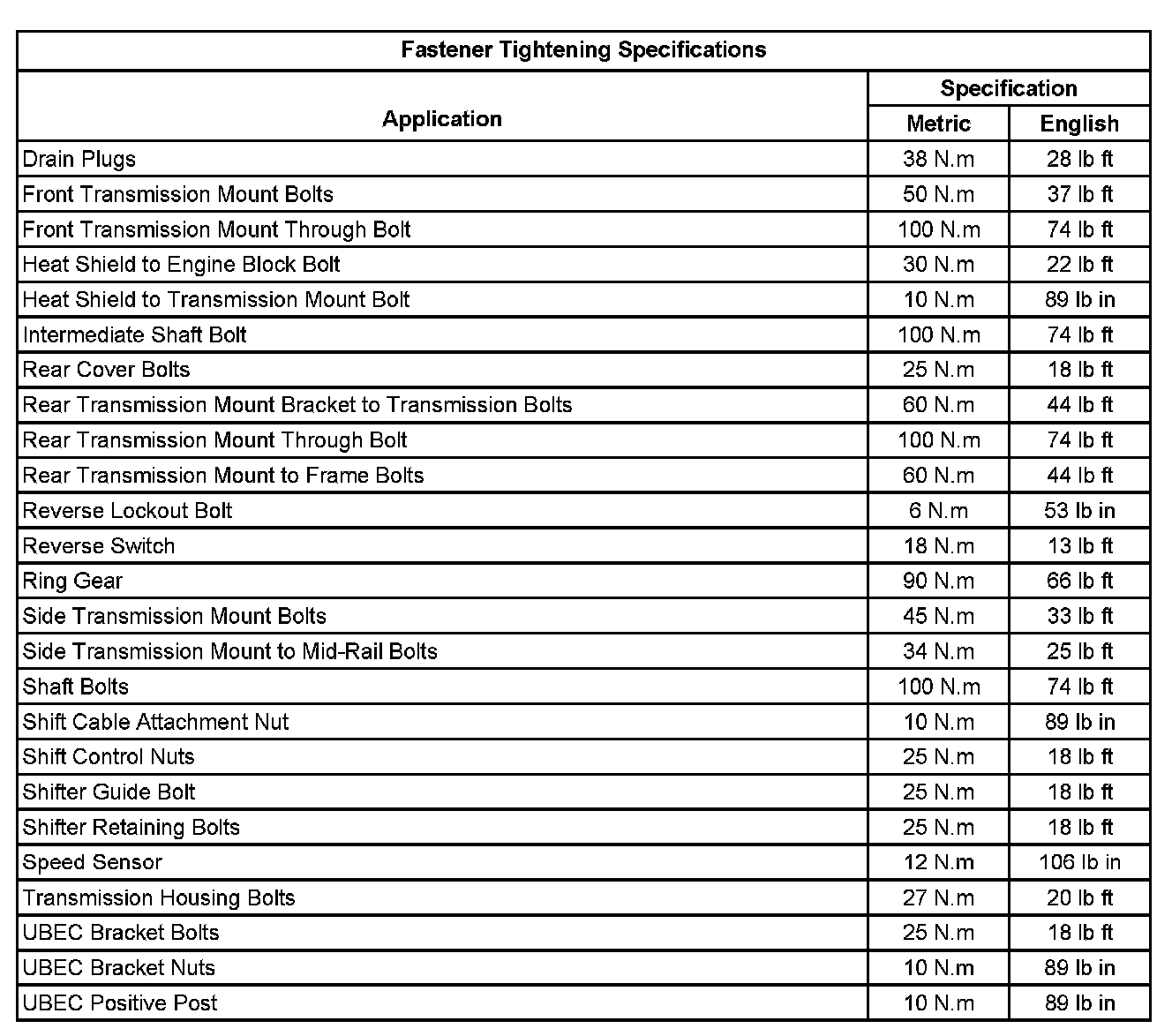 Fastener Tightening Specifications: