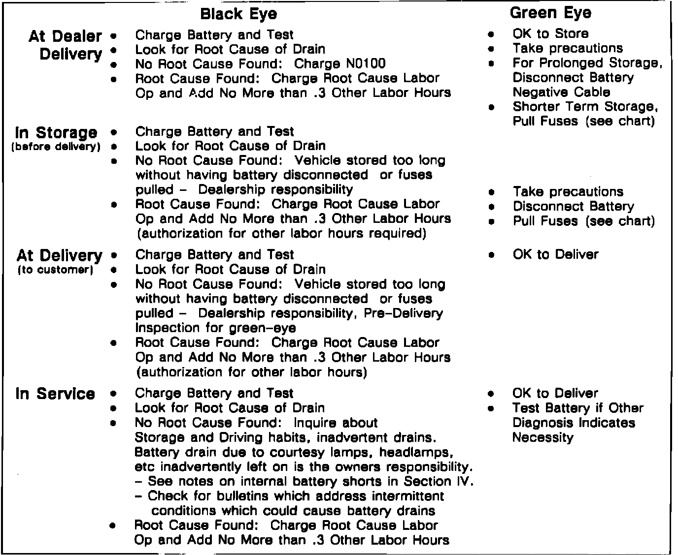 Following proper testing and parasitic diagnosis procedures are in the best interests of the dealership in light of Warranty Policies and procedures outlined in DSIB 89-I-9. This bulletin states that Labor Operation N0100, "Battery charge and test", is to be used only in case of new vehicles received from the carrier with a discharged or "Dark Eye" battery. Recharge and/or replacement of new vehicle batteries on unsold cars in dealer inventory are the responsibility of the dealership.FIGURE 2 - WARRANTY PROCEDURE UNDER VARIOUS CONDITIONS: