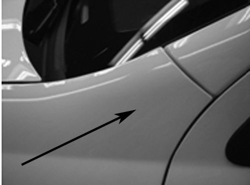 5. Reinstall the fender fasteners and align the fender to ensure that the sealing patch is making contact with the lower A pillar sheet metal surface. Tighten the fasteners. Refer to Front Fender Replacement in SI