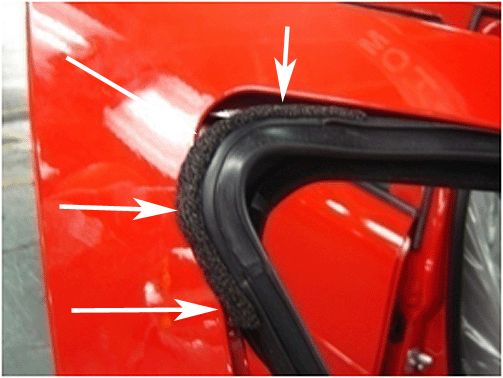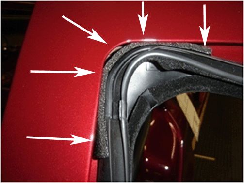 2. If the run channel is correctly seated to the door frame and the noise still exists, the foam seal attached to the run channel in the inner upper rear corner may be missing or out of position.