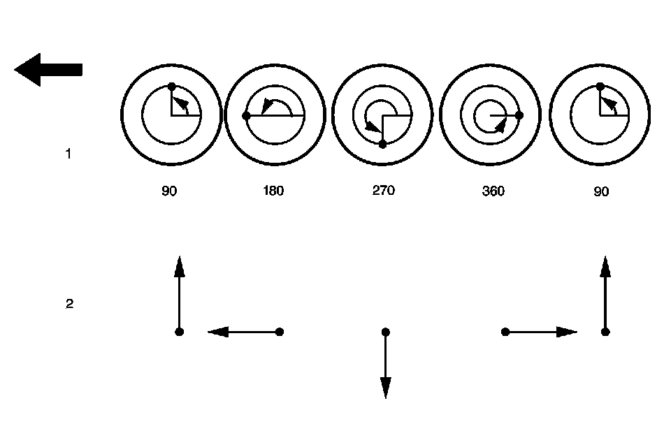 The motion of the stick occurs in repetitive cycles. The cycle begins at midpoint, continues through the lowest extreme of travel, then back past the midpoint, through the upper extreme of travel, and back to the midpoint where the cycle begins again.