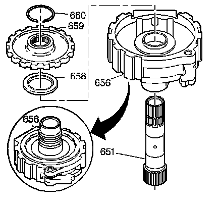 6. Remove the forward clutch support (656) from the final drive sun gear shaft (651).