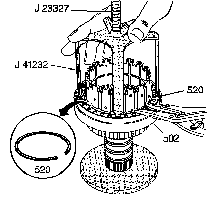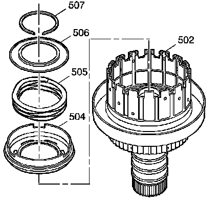 23. Remove the coast clutch return spring retainer (506) and the release spring (505).