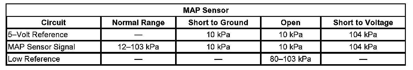 Under normal operation the greatest pressure that can exist in the intake manifold is equal to BARO. This occurs when the vehicle is operated at wide-open throttle (WOT) or when the ignition is on while the engine is off. Under these conditions, the ECM uses the MAP sensor to determine the current BARO. The least manifold pressures occur when the vehicle is idling or decelerating. MAP can range from 11 kPa, when pressures are less, to as great as 103 kPa, depending on the current BARO. The ECM monitors the MAP sensor signal for pressure outside of the normal range.