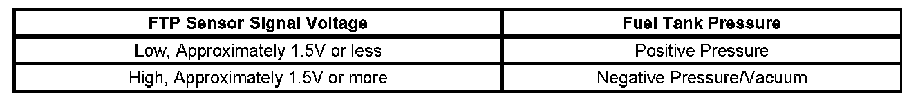 1. Ignition ON and fuel cap removed, verify that the FTP sensor parameter is between 1.3-1.7 volts.