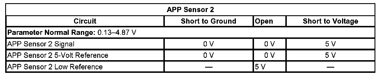 - Accelerator Pedal Position (APP) Sensor 2 Circuit Low Voltage