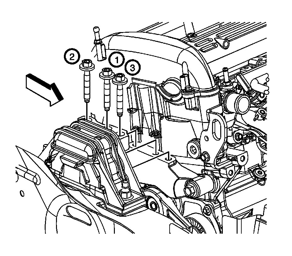 Important: The engine mount to bracket bolts must be hand started. Do not pry the engine mount to align the holes.