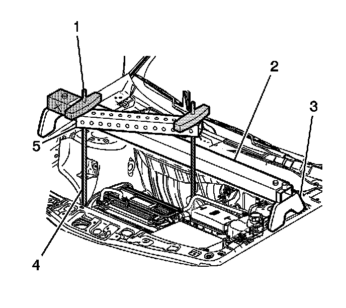 1. Place the engine support fixture long bar (2), from the J 28467-B across the engine compartment.