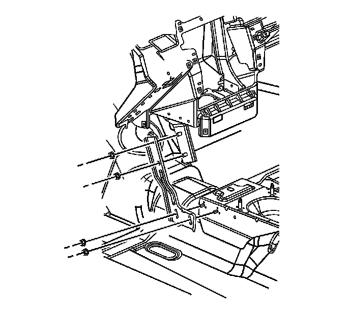 3. Pull back the carpet at the bottom of the left instrument panel (I/P) center support bracket and remove the left I/P center support bracket nuts.