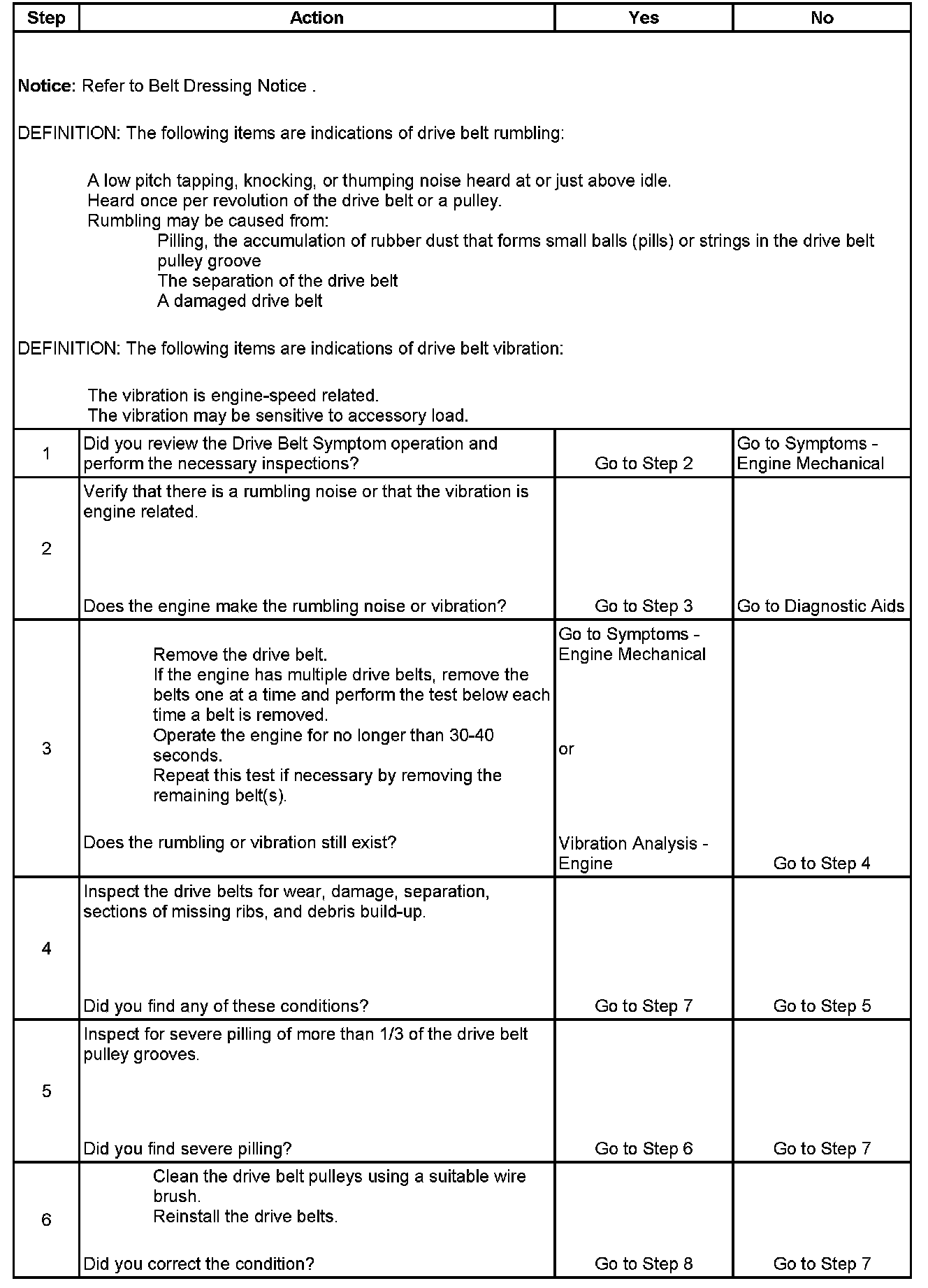 3. This test is to verify that one of the drive belts is causing the rumbling noise or vibration. Rumbling noise may be confused with an internal engine noise due to the similarity in the description. Remove only one drive belt at a time if the vehicle has multiple drive belts. When removing the drive belts the water pump may not be operating and the engine may overheat. Also DTC's may set when the engine is operating with the drive belts removed.