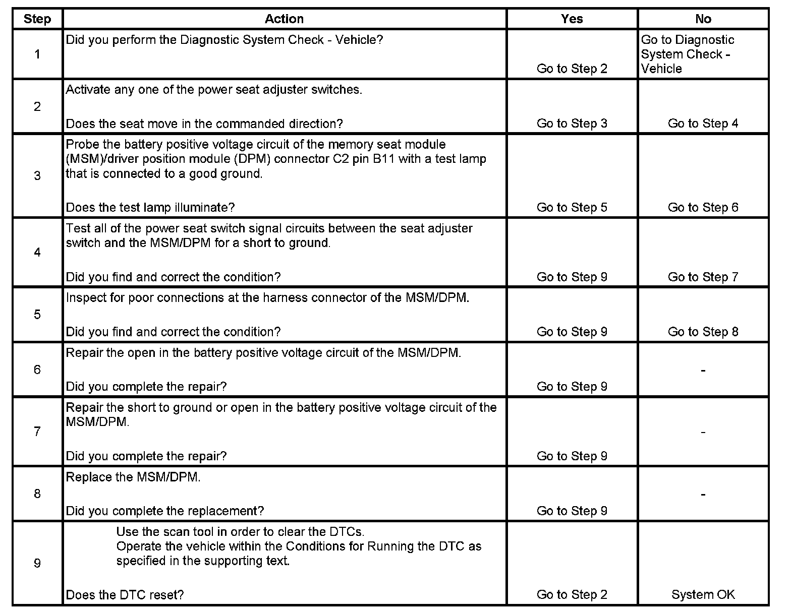 Battery positive voltage is supplied at all times to the seat adjuster switch and the memory seat module (MSM)/driver position module (DPM) through the same circuit. The MSM/DPM uses this battery voltage input to determine if battery positive voltage is applied to the seat adjuster switch.